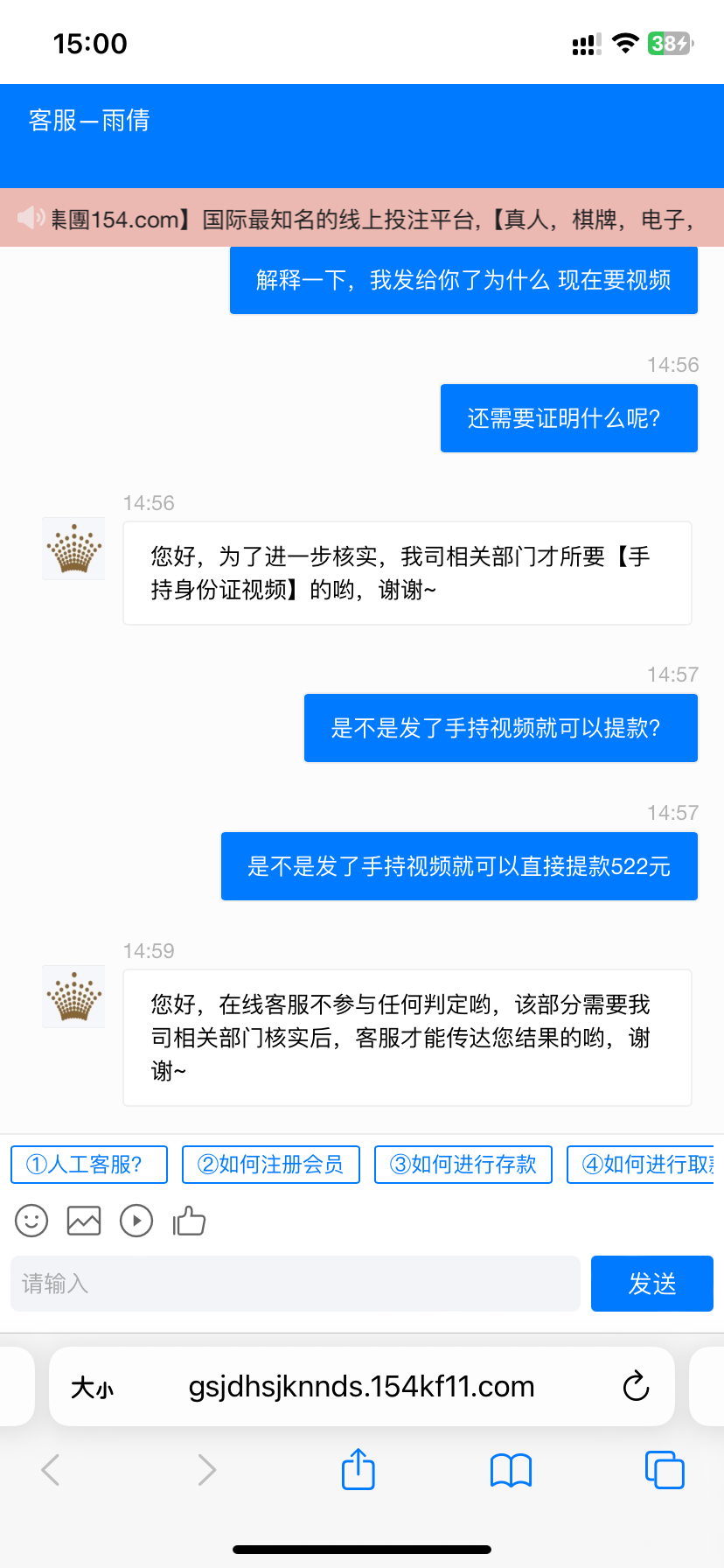 都玩了两三年的平台,现在也开始黑了,大家注意吧 存了140提520都黑。上传了证件和手持,又要视频。以前存50提2000都几分钟到的。无语。看来现在不能玩了,赢了300多块钱就开始这样了。